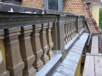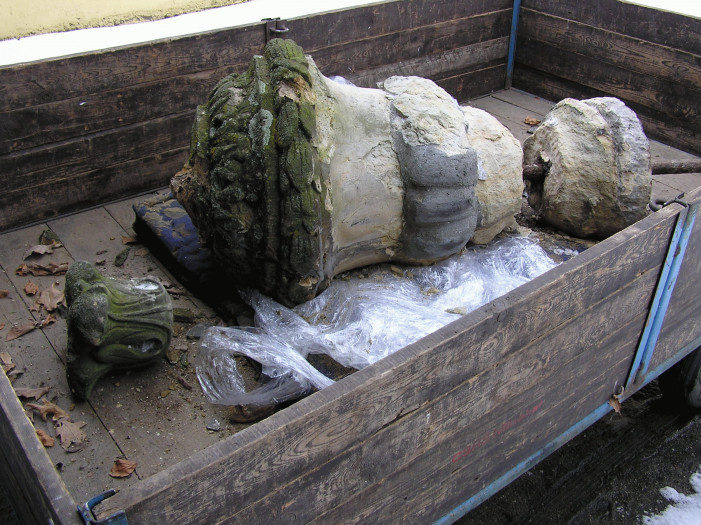 Die Sandteinvase stand vermutlich seit 1720 als Schlussstein auf dem Schlossdach. 2006 vom Sandsteinkünstler Marx aus Kreba-Neudorf originalgetreu, neu geschaffen.
