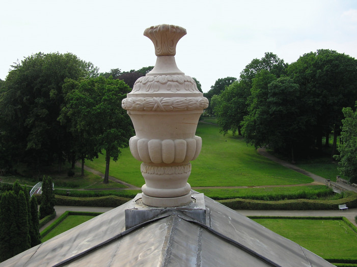 Die Sandteinvase stand vermutlich seit 1720 als Schlussstein auf dem Schlossdach. 2006 vom Sandsteinkünstler Marx aus Kreba-Neudorf originalgetreu, neu geschaffen.