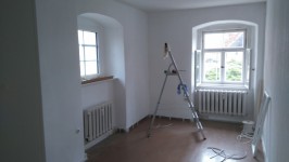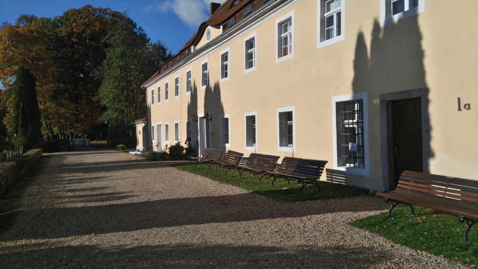 Südfront 1 A verputzt und gestrichen. 2016. Fünf von 23 Parkbänken sind gereinigt und neu gestrichen, bevor sie ins Winterquartier wandern.