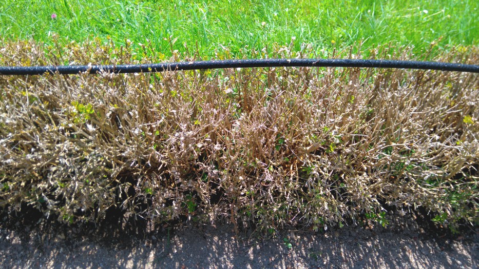 Die weitgehend zerstörte Buchshecke zeugt von der Anweseheit des Buchsbaumzünslers.